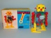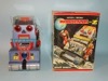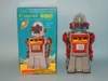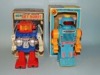 | Lot # 89 - LOT OF 2 ROBOTS: Includes 1) NEW SKY ROBOT: Horikawa..O/B..8.5"H plastic BO. Moves with walking motion and flashing light as chest wheels turn. Box front panel is faded. VG-C9. 2) LAUGHING ROBOT: Yonezawa..O/B..9.5"H plastic BO. Moves with mystery action. Push his head and he stops and laughs or makes a space sound. Box with inserts. Window plastic is damaged. VG-C9+ | ||