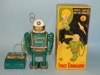 | Lot # 45 - CRAGSTON ASTRONAUT (A.K.A. SPACE CONQUEROR): Daiya..O/B..12"H tin BO. Moves with walking motion as the antenna spins. He stops and raises his gun with flashing light and firing noise. Battery box has some rust. Box has a repaired front panel tear and a few small spots of missing surface paper, mostly on one side panel G/VG-C7/8 | ||