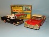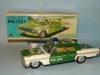 | Lot # 305 - LOT OF 2 BATTERY TOYS: Includes 1) 1959 FORD FAIRLANE SKYLINER: Yachio..11"L tin BOR. Two tone two door convertible with retractable top. Works but sluggish. Steering not working. Reproduction box. C8. 2) POLICE CAR: Japan..O/B..8.75"L tin BOR. Not working. Box has repairs. G-C8 | ||