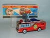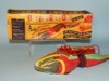 | Lot # 60 - FIRE ROCKET X-0077: Yonezawa..O/B..14.25"L tin FR. Advances with siren and spark (working). The spring loaded nose cone launches the plastic pilot in the air when the toy runs into something. The top fin is complete with the small rubber tip. Nice box has a small front panel puncture E-C8/9 | ||