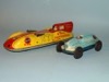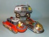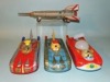 | Lot # 81 - LOT OF 2 SPACE TOYS: Includes 1) BLUE EAGLE SPACE ROCKET: Masuya..15"L tin BOR. Folding wings and flashing light. C8. 2) TERRA-MARS FLYING SAUCER: SFA (France)..7.25"L tin. Unpowered. Surface rust along the back crimp edge. C7 | ||