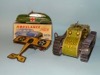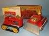 | Lot # 294 - LOT OF 2 TIN TRACTORS: Includes 1) VIRVOLT BULLDOZER ELECTRIQUE: CHR (France)..O/B..15"L tin BO. With driver and instruction sheet. Treads need replacing. Untested-European battery. Box has red tape on both ends. VG-C8. 2) TRATTORE A CINGOLI: Italy..O/B..8.5"L tin BO. Rubber treads OK. Untested-European battery. VG/E-C9 | ||
