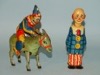 | Lot # 322 - LOT OF 2 TIN WINDUP TOYS: Includes 1) HAPPY CLOWN: Distler..6"H tin WU. Clown changes facial expressions as he raises and lowers. Nice color. C8. 2) CLOWN RIDING DONKEY: Blomer & Schuler..6"H tin WU. One leg needs adjustment. C7 | ||