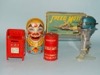 | Lot # 340 - LOT OF 4 TIN TOYS: Includes 1) SPEED MOTOR: Sakai..O/B..5.5"H tin/die cast AC. With stand. Missing one clamp screw. Untested. Box has a repaired corner. VG-C9. 2) DODGE SAVES OIL DRUM BANK: Unknown..3.25"H tin. C8. 3) CLOWN BANK: CHEIN..5"H tin. With trap. C7. 4) MAILBOX BANK: Unknown..4"H tin. With key. C7 | ||
