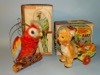 | Lot # 367 - LOT OF 2 BATTERY TOYS: Includes 1) PRETTY PEGGY PARROT: Rosko/Japan..O/B..13"L mixed material. Moves head with lighted eyes from side to side as she flaps wings and squawks. Minor fading. Battery clasp needs to be reattached. Heavily soiled box. F-C8. 2) TEDDY GO-KART: Alps..O/B..8"H mixed material BO. Moves with walking motion. Box has tears. VG-C8 | ||