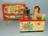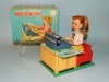 | Lot # 380 - BUSY SECRETARY: Linemar..O/B..7.5"H tin BO. Girl moves her head from side to side as she types on a lighted typewriter. Original typing paper. Box has several small repaired tears VG-C9 | ||