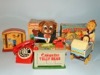 | Lot # 377 - LOT OF 3 BATTERY TOYS: Includes 1) FIDO THE XYLOPHONE PLAYER: Alps..O/B..8.5"H mixed material BO. Eyes light but doesn't work. Nice color and condition. VG-C9. 2) DRINKING MONKEY: Alps..O/B..9.5"H mixed material BO. Nice color and condition but not working. VG-C9. 3) LADY PUP TENDING HER GARDEN: Tomiyama..O/B..8"H mixed material. Working. One rubber hand damaged. Small red flower missing several petals. Box has two areas of surface paper damage on one side panel. VG-C7 | ||