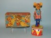 | Lot # 328 - DRUMMER MONKEY: Marusan..O/B..7"H tin WU. Monkey plays drum as umbrella spins. Missing one of the celluloid balls, one needs to be reattached and two are dented. Box has a repaired corner. Hard to find toy VG-C8/9 | ||