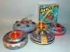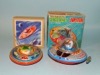 | Lot # 9 - LOT OF 2 TIN SPACE TOYS: Includes 1) FLYING SAUCER WITH SPACE PILOT: Yoshiya..O/B..7.75"W tin BO. Beautiful shape but not working. Rough box. F-C9+. 2) FLYING SAUCER WITH SPACE PILOT: Yoshiya..O/B..7.75"W tin BO. Battery box damage. Top half looks good. Not working. VG-C7 | ||