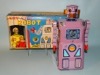 | Lot # 74 - NON STOP ROBOT (A.K.A. LAVENDER ROBOT)..Masudaya..O/B..14.75"H tin BO. Moves with non stop action and flashing lights. Minor edge wear on the litho'd panels. The solid color lavender surfaces appear to be repainted. Box top has corner and seam repairs. The side corners are missing small pieces where the staples were VG-C8 | ||
