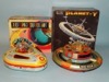 | Lot # 7 - LOT OF 2 TIN SPACE TOYS: Includes 1) PLANET Y SPACE STATION: Nomura..O/B..9.25"W tin BO. Red surfaces faded a bit. Lights work but doesn't run. E-C8. 2) X-07 SPACE SURVEILLANT: Masudaya..O/B..8.5"L tin BO. Moves with mystery action and flashing lights. Blue surfaces are heavily faded. Box has a corner tear. VG-C7 | ||