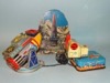 | Lot # 84 - LOT OF 4 SPACE TOYS: Includes 1) UFO XO5: Masudaya..O/B..7"W tin/plastic BO. E-C9+. 2) SPACE PATROLER X-081: Yoshiya.. 7.5"W tin/plastic BO. Works but axle is bent. Dome cracked. C8. 3) SPACE PATROL 2019: 8"W tin/plastic BO. Not working. C7. 4) XX-61 FLYING SAUCER: France..10.25"W tin BO. Missing the pilot, one antenna and trim ring to hold the toy together. Takes a European battery-untested. Rare toy. C7 | ||